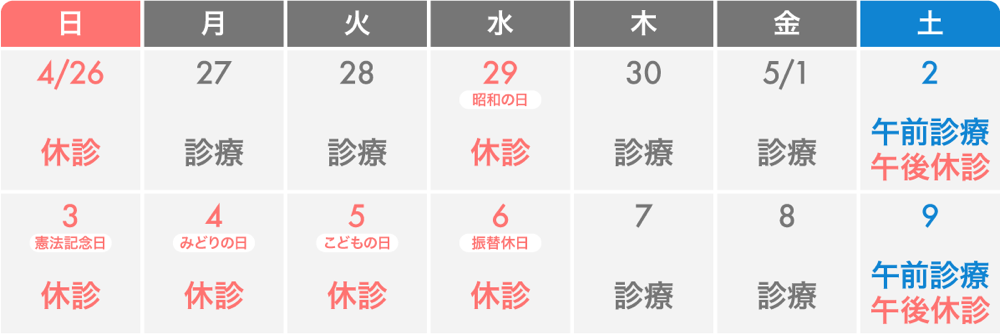 | 2026年4月25日 | ゴールデンウィークは暦通り診療いたしますNEW |